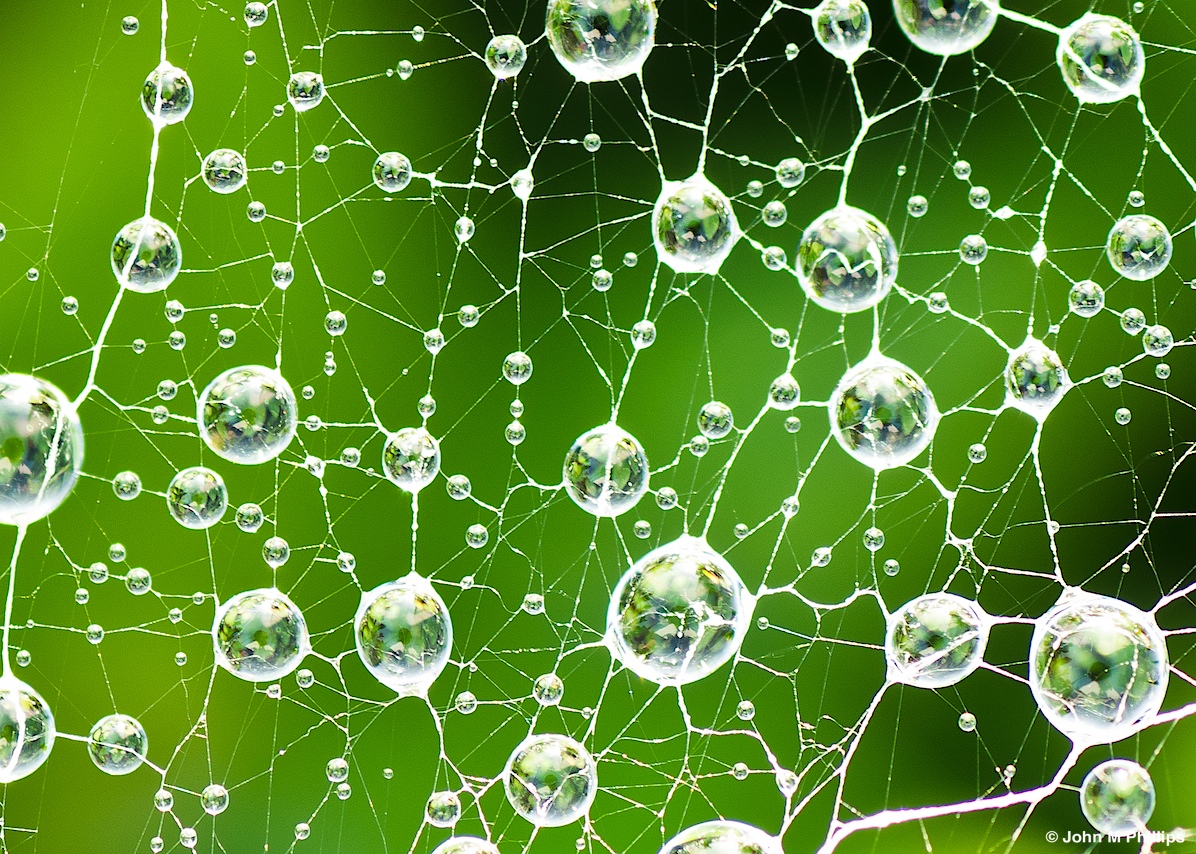 This was taken at a extremely narrow aperture of f/57. Because of the "flatness" of the array, the drops are in very good focus across the image. In addition, because of the narrow aperture, the webbing is also in good focus. Unfortunately, the foliage is also in fairly good focus, creating a major distraction.